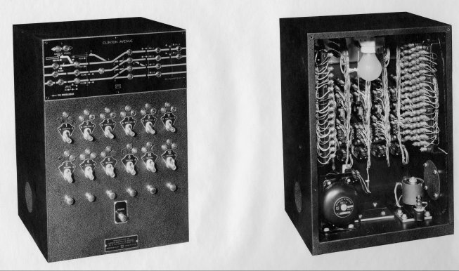 This is a Union switch and Signal style B60 control cabinet. It was built in 1953 for the Central Railroad of New Jersey to control swtiches and signals at Clinton Avenue interlocking in South Plainfield,New Jersey. This was a temporary installation and was used to re-route traffic while railroad elevation construction was underway through South Plainfield. It was direct wire control and was located in a place called "MACK" tower which was an old railroad coach. The other end of the elevation project was at Middlesex, located in "LINCOLN" tower. This control cabinet was also salvaged and resides here.